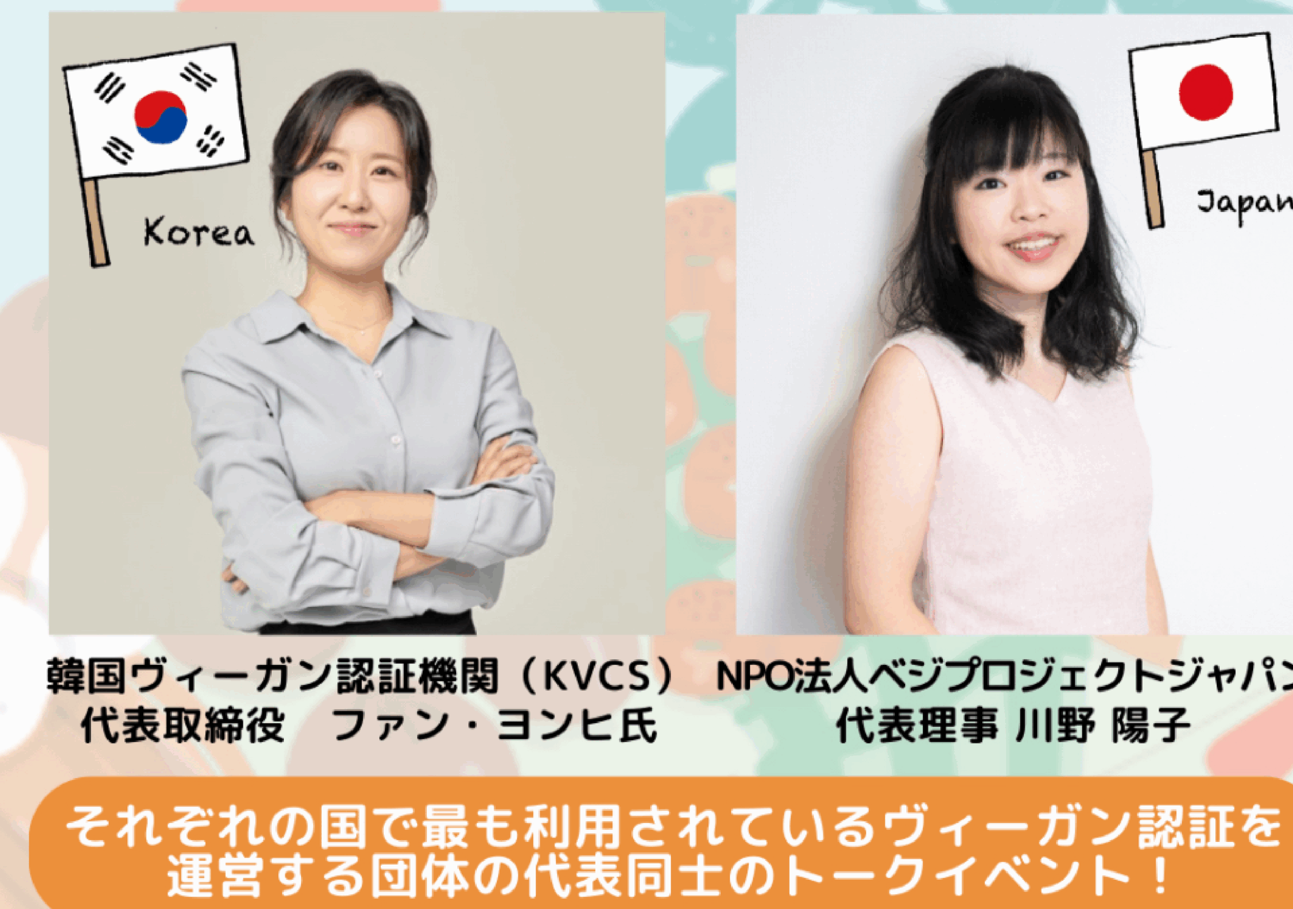 content 日本および韓国で、それぞれの国で最も利用されているヴィーガン認証マークを発行する団体の代表が集い行われるトークイベント! 韓国のヴィーガン認証機関 Korea Agency of Vegan Certification and Services (KVCS)のファン・ヨンヒ代表が来日し、日本のヴィーガン界を牽引するNPO法人ベジプロジェクトジャパンの川野陽子代表との対談をします。 両者のヴィーガン認証を行う上で見えるヴィーガン市場の展望や両国間での協業、発展について、議論します。 A talk event bringing together the heads of the organizations that issue the most widely used vegan certification marks in Japan and Korea! Hwang Young-Hee, head of the Korean vegan certification body Korea Agency of Vegan Certification and Services (KVCS), will visit Japan to have a dialogue with Haruko Kawano, head of VegeProject Japan, a key player in Japan’s vegan movement. They will discuss perspectives on the vegan market as seen through their certification work, as well as collaboration and development between the two countries.
